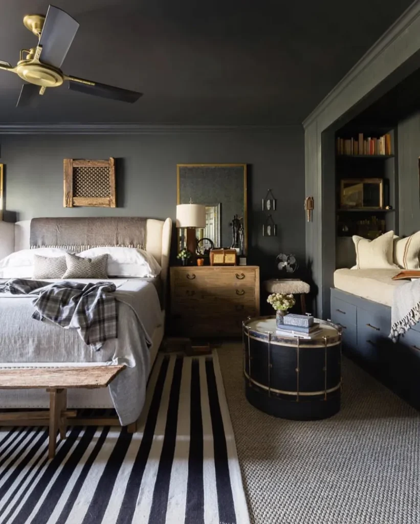 Charcoal walls and a matching dark ceiling create a deeply immersive and moody bedroom environment in this character-filled space. You will love how the brass ceiling fan and gold-framed mirror add a touch of vintage shine against the matte surfaces. This bold color choice transforms a multifunctional room into a cohesive, high-end sanctuary.