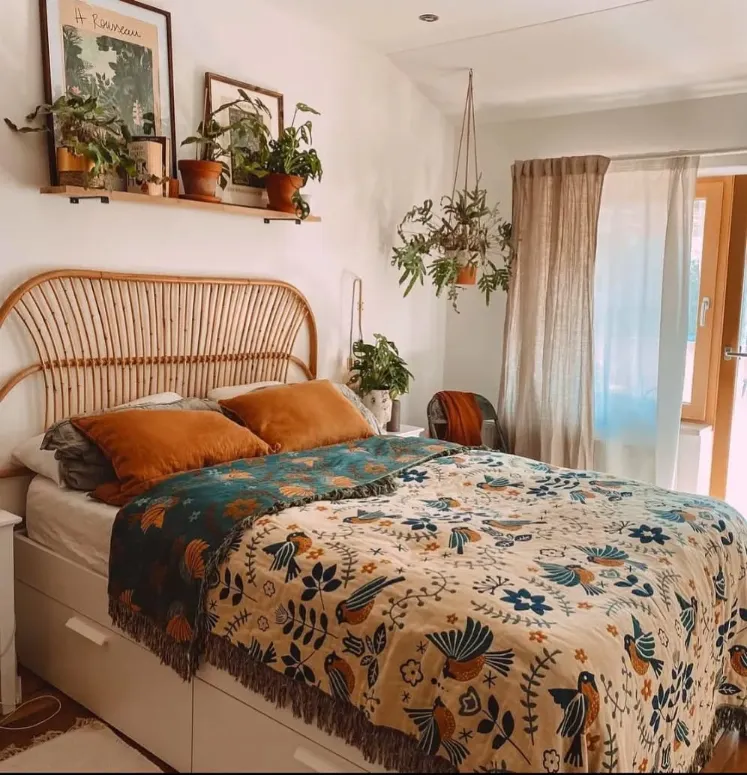 Incorporate life-filled elements by utilizing a floating wooden shelf for potted plants and classic art prints directly above the bed. Adding a hanging planter near the window draws the eye upward and maximizes the lush, indoor-outdoor feel of the room. This curated mix of natural fibers and botanical patterns creates a cheerful, light-filled retreat that feels both cozy and inspired.