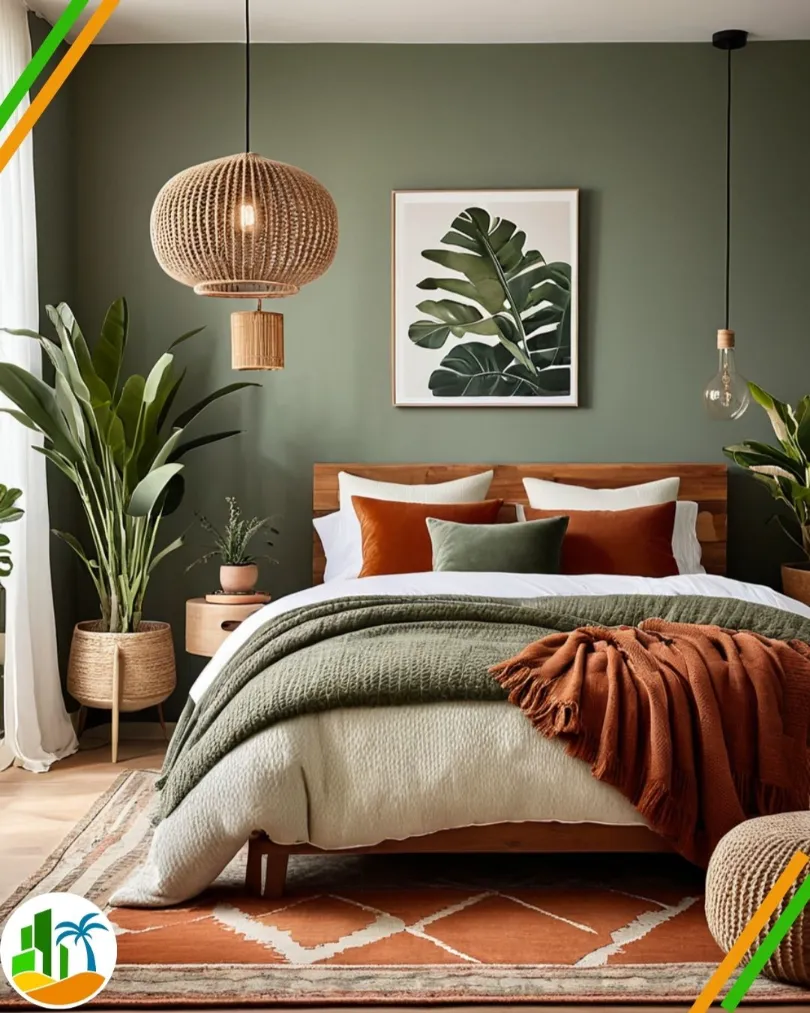 Create a vibrant yet grounding Organic Modern Bedroom by pairing deep sage green walls with rich terracotta accents. The natural wood bed frame and matching circular nightstand provide a warm, sturdy base for the plush cream bedding, which is beautifully layered with a textured olive throw and rust-colored pillows. You will find that these earthy tones work together to create a space that feels both energized and peaceful.