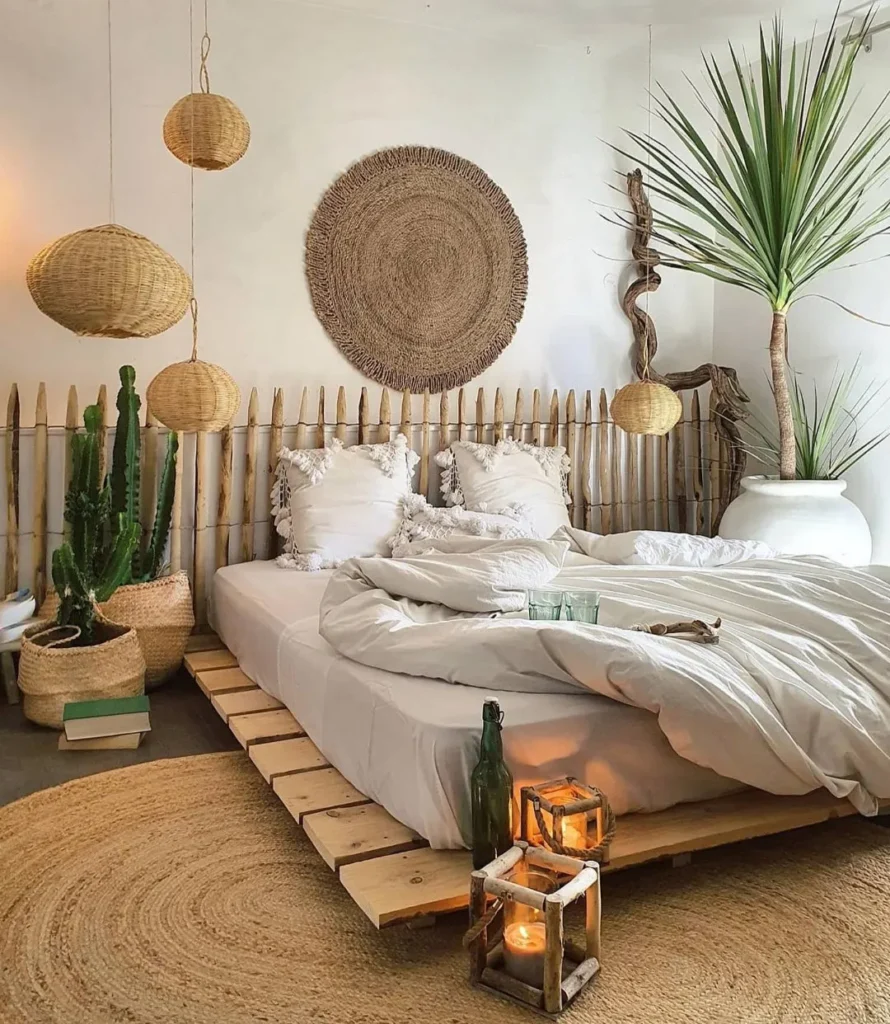 A low wooden platform bed serves as the perfect foundation for this Organic Modern Bedroom layout. Bamboo fencing acts as a creative headboard to bring an outdoor texture inside. Woven pendant lights hang at various heights to add visual interest and a soft glow.