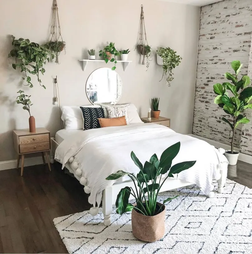 Layer olive green throw pillows and a chunky knit blanket to echo the natural colors of your plants. Use crisp white bedding as a clean backdrop to let these rich, earthy textures truly stand out. This design creates a refreshing and tranquil atmosphere that helps you feel connected to nature throughout the day.