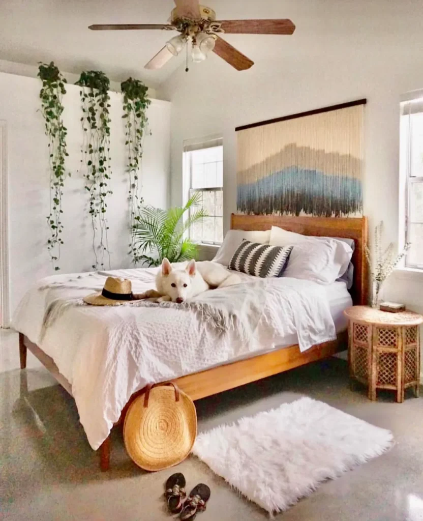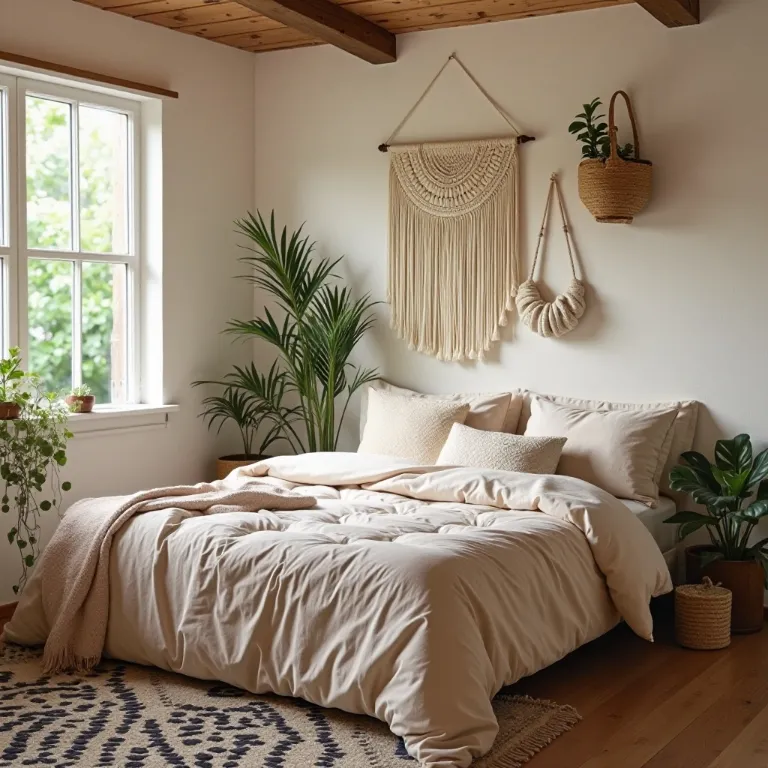 Focus on high-contrast textures to bring a monochromatic Organic Modern Bedroom to life. A plush, cream-colored duvet provides a soft and inviting center, while an oversized macramé wall hanging adds intricate, handcrafted detail above the bed. You will find that incorporating varied woven elements, like a hanging jute basket and a patterned tribal rug, adds depth without the need for bold colors.