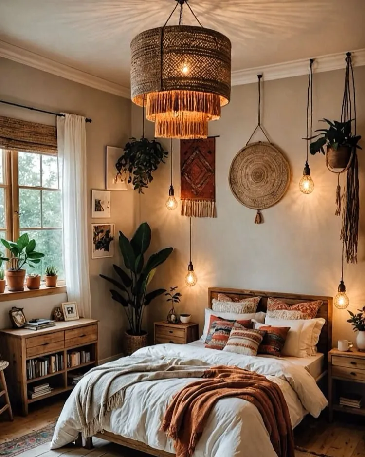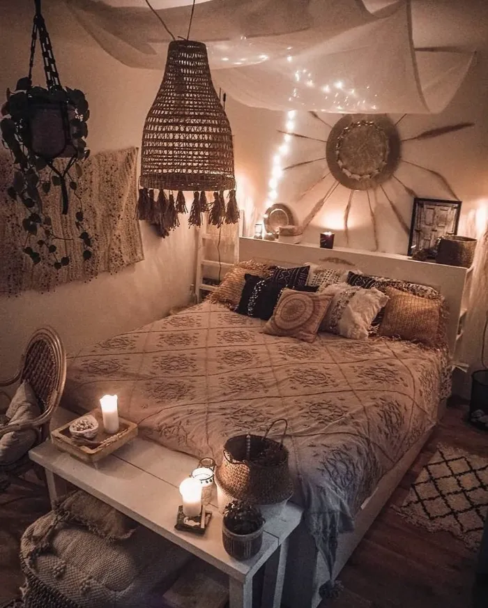 Layer numerous patterned pillows on the bed to provide maximum comfort and visual richness. Incorporate a large wicker pendant light to serve as a stunning focal point above the sleeping area. This combination of soft lighting and heavy texture ensures your room feels like a private, magical sanctuary.
