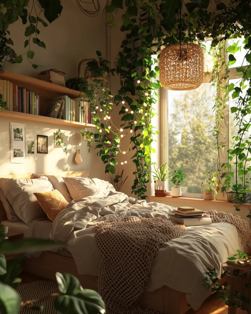 Create a dreamlike Organic Modern Bedroom by allowing lush climbing vines to frame your window and canopy over your sleeping area. The golden afternoon light filters through the leaves, illuminating a cozy bed layered with a neutral duvet and a chunky, open-knit throw. You will find that stringing delicate fairy lights through the foliage adds a touch of evening magic and a soft, ambient glow.