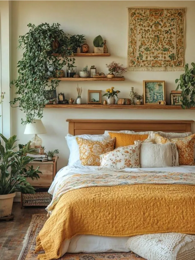 Layer vibrant mustard tones with lush greenery to create an energetic Organic Modern Bedroom. Use multiple floating wooden shelves to display a curated collection of small plants and framed vintage sketches. This vertical garden effect brings life to your walls while maintaining a clean, organized aesthetic.
