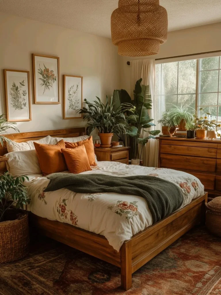 Incorporate a large woven pendant light to serve as a stunning, textured focal point above the bed. Use vintage-inspired botanical wall art to create a cohesive and artistic atmosphere on neutral walls. This blend of wooden furniture and lush foliage creates a grounded, peaceful retreat for ultimate relaxation.