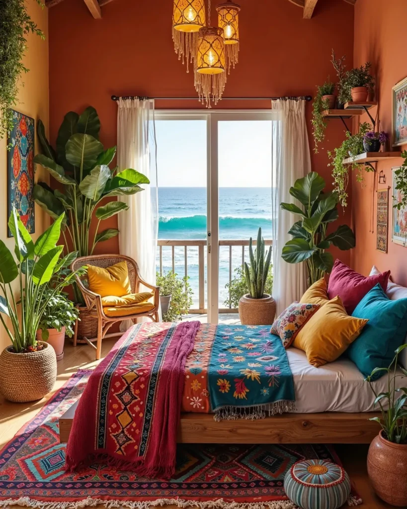 Design a breathtaking Organic Modern Bedroom by combining bold terracotta walls with a stunning ocean view. Use colorful, hand-embroidered textiles and plush velvet pillows to create a lively, globally-inspired focal point. These rich patterns and deep jewel tones provide a beautiful contrast against the bright, natural light.
