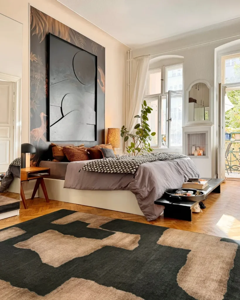 A crisp white platform bed creates a modern, clean-lined anchor for this high-ceilinged Organic Modern Bedroom. The dramatic black-and-gold bird mural provides a moody, artistic backdrop for the bed, while the oversized geometric rug adds a bold graphic element to the warm herringbone floors. You will find that the mixture of charcoal linens and animal-print pillows offers a perfect blend of contemporary edge and cozy texture.