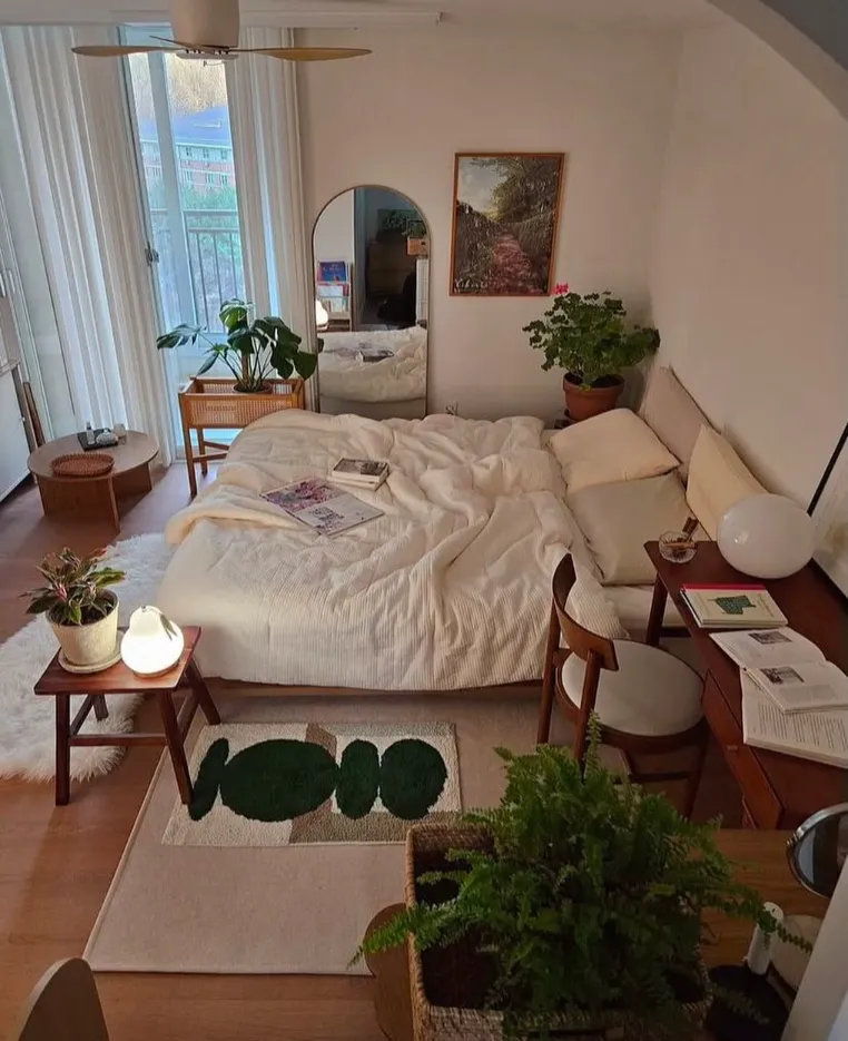 Utilize floating wooden shelves to display vintage-inspired art and cascading greenery, which helps keep the floor area clear and airy. A full-length leaning mirror and a minimalist drum pendant light further enhance the room’s functional yet serene design. This intentional combination of living textures and maximized natural light creates a cheerful sanctuary full of vitality.