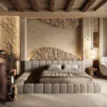 Incorporate raw wood stump side tables to emphasize the connection to nature. Use a monochromatic palette of sand and clay to maintain a sophisticated, grounded feel. This striking design combines high-end comfort with rugged, elemental textures for a truly unique and peaceful sleeping environment.