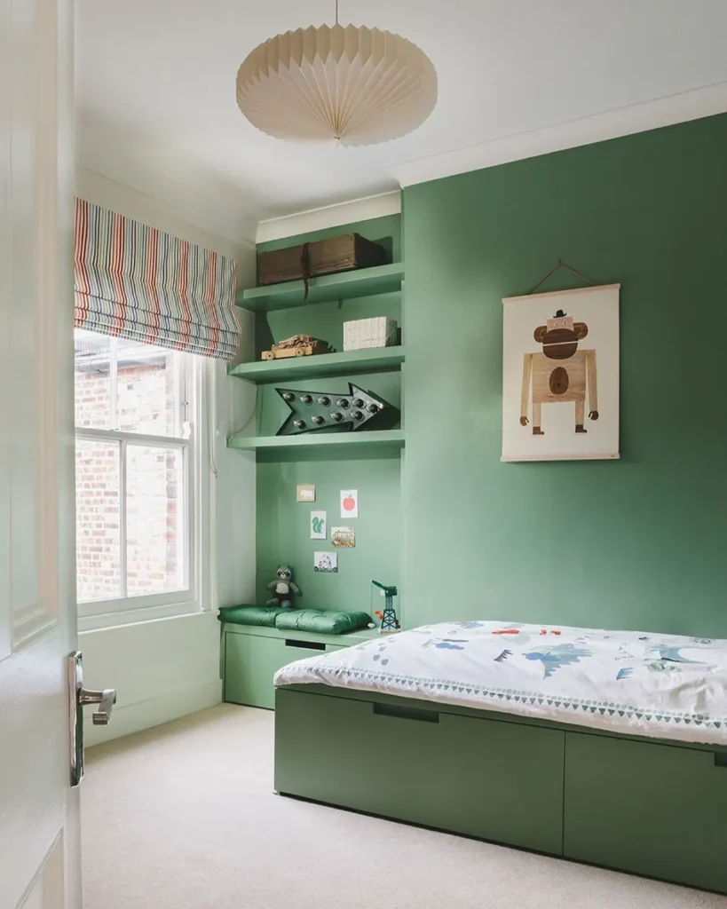This vibrant sage green bedroom features a custom-built storage bed and matching floating shelves for a cohesive look. The bold green walls create a lively yet calming environment that is perfect for a child’s creative sanctuary. You will notice how the colorful striped roman blinds add a fun pop of pattern to the window.