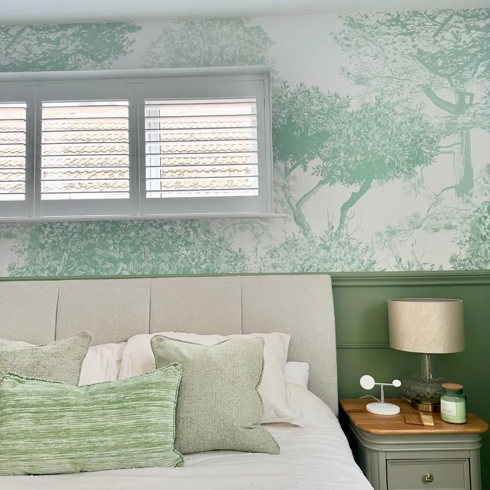 This enchanting sage green bedroom features a large-scale botanical mural that brings a refreshing, forest-like atmosphere to the space. The detailed green tree designs on the upper wall are perfectly balanced by a solid green wainscoting on the lower half. You will notice how the crisp white window shutters allow natural light to filter in, highlighting the intricate patterns of the wallpaper.