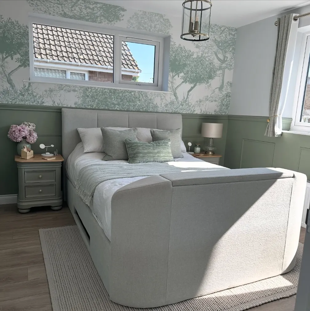 A plush, light grey upholstered bed—featuring a modern integrated TV lift—serves as the luxurious centerpiece of the space. You will notice how the grey-green textured pillows and soft throw blanket harmonize perfectly with the mural’s earthy tones. I love how the traditional grey nightstands and warm wood tops ground the whimsical wall decor, while fresh hydrangeas add a soft, natural touch to the bedside
