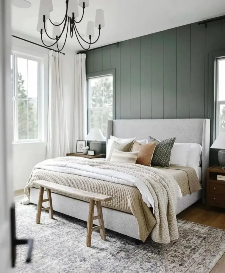 This elegant sage green bedroom features a sophisticated accent wall with deep vertical paneling that adds height and architectural interest to the space. The soft grey-green tone provides a serene backdrop for the oversized, light grey upholstered headboard. You will notice how the layered bedding—including a quilted taupe throw and textured accent pillows—creates a cozy, high-end hotel feel.