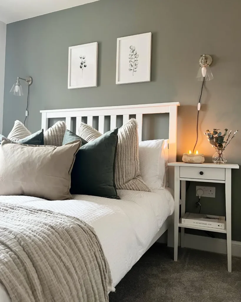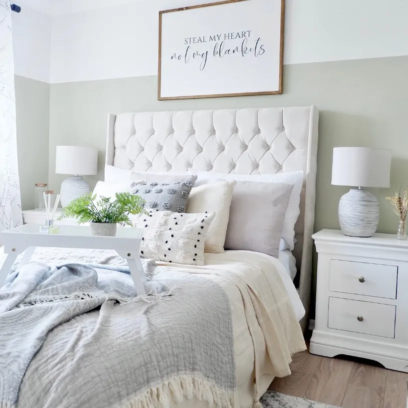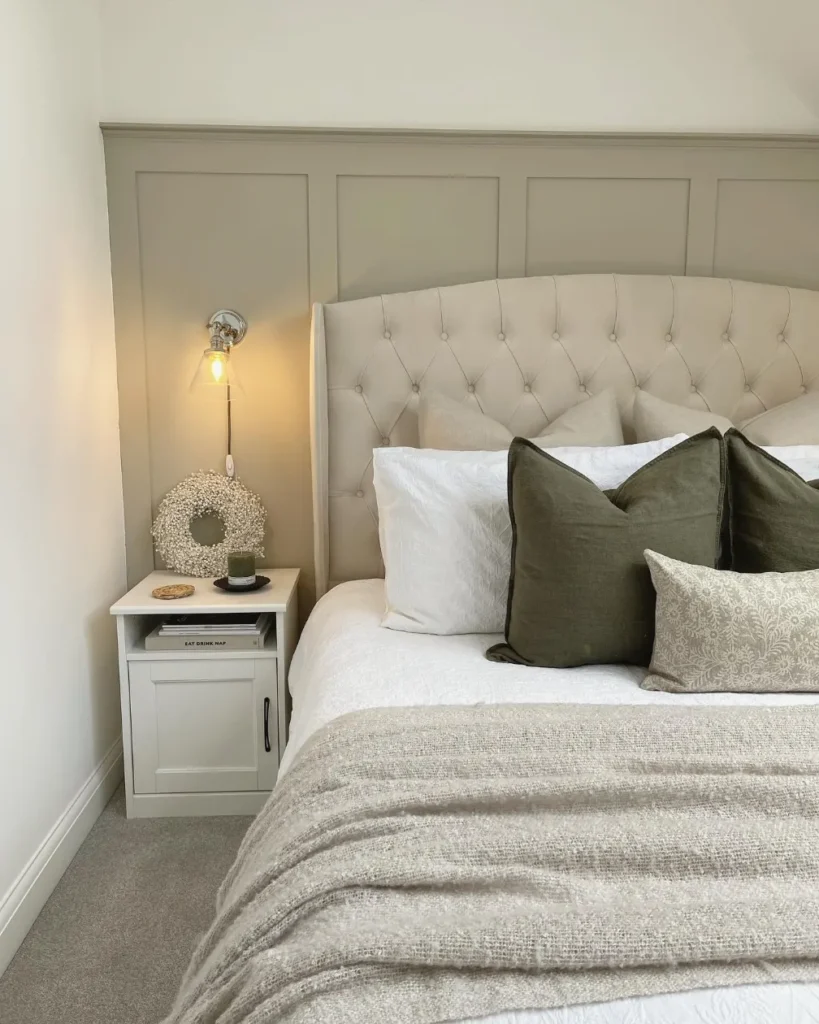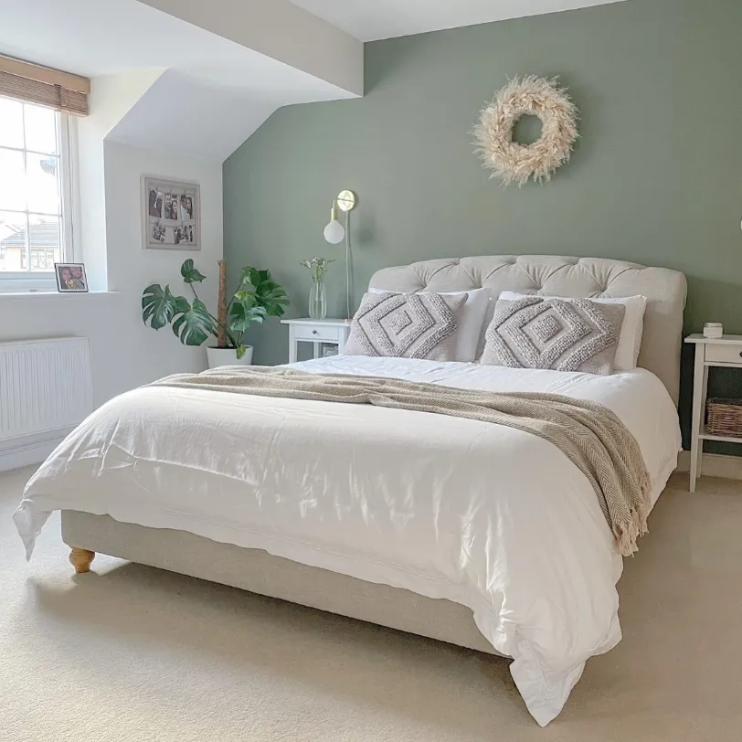 This beautiful setup features a muted sage green bedroom wall that anchors the entire sleeping area. The tufted beige headboard and crisp white bedding create a soft, inviting contrast against the earthy paint. You can see how the textured pampas grass wreath adds a trendy, bohemian touch to the vertical space.