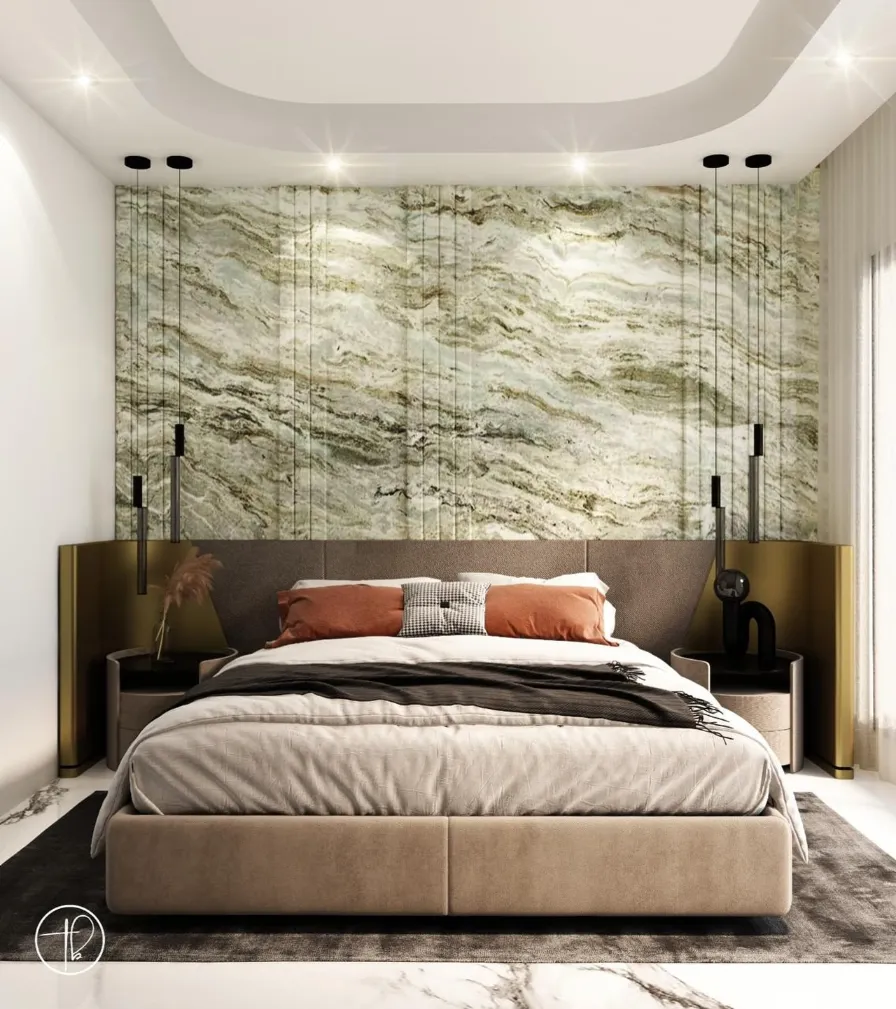 This luxurious sage green bedroom showcases a stunning marble accent wall with organic veining. The stone pattern introduces a high-end feel while maintaining a natural, earthy connection. You can see how the gold panels and sleek pendant lights frame the bed with sophisticated elegance.