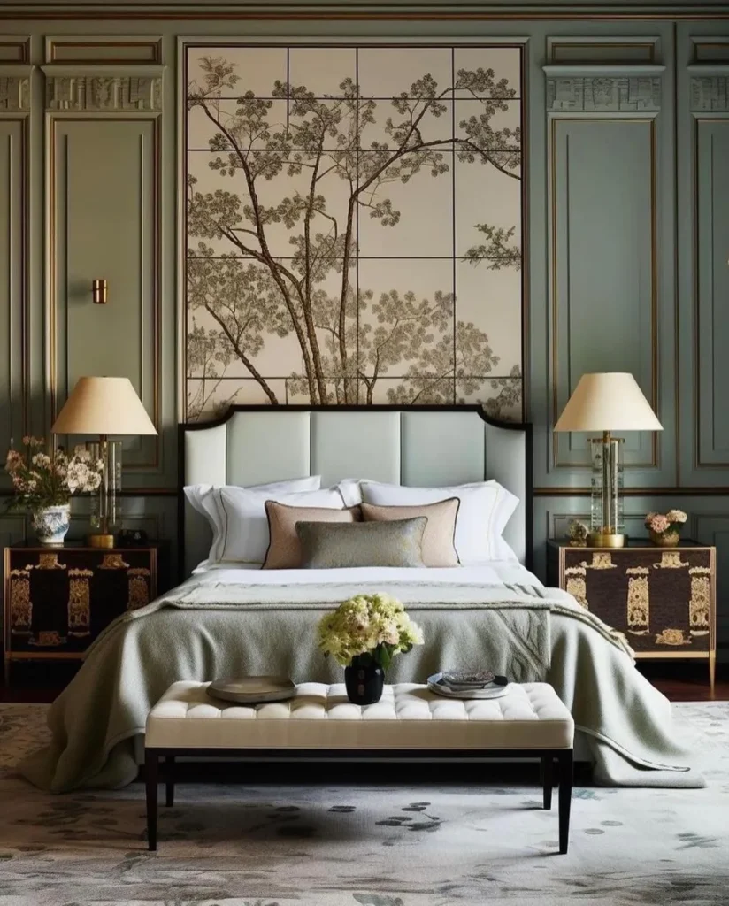 This sophisticated sage green bedroom features stunning wall paneling and a large-scale botanical mural. The intricate tree design adds an artistic focal point that brings the outdoors inside with style. You will notice how the gold accents on the nightstands and lamps elevate the room’s luxurious atmosphere.