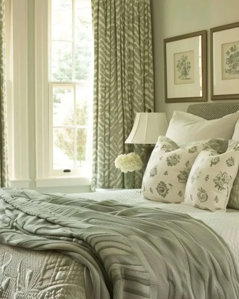 This classic sage green bedroom design focuses on rich textures and intricate patterns to create a cozy, lived-in feel. The heavy chevron curtains frame the window while adding significant visual interest to the neutral walls. You can achieve this look by layering a chunky knit throw over quilted white bedding for maximum comfort.