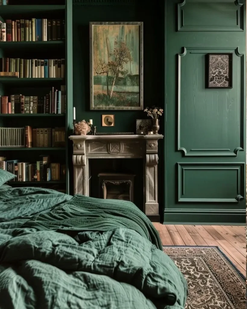 This dramatic sage green bedroom transitions into a moody emerald tone with floor-to-ceiling built-in bookshelves. The ornate fireplace mantel and traditional wall molding create a sophisticated architectural backdrop for your sleeping quarters. You can see how the deep green linen bedding perfectly complements the rich wood tones of the vintage flooring.
