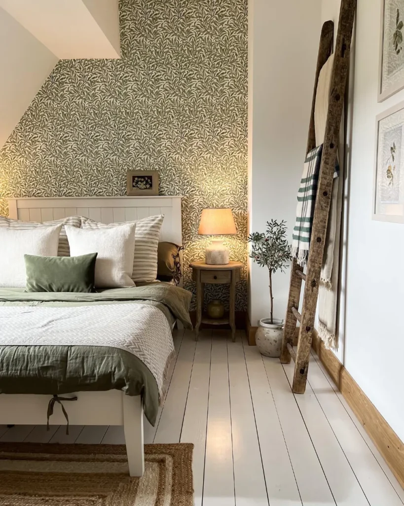 This charming sage green bedroom features an intricate leafy wallpaper that adds immediate personality to the slanted ceiling nook. The white paneled headboard and crisp linens provide a bright contrast against the detailed green patterns. You will notice how the olive duvet cover anchors the bed while tying into the botanical wall design.