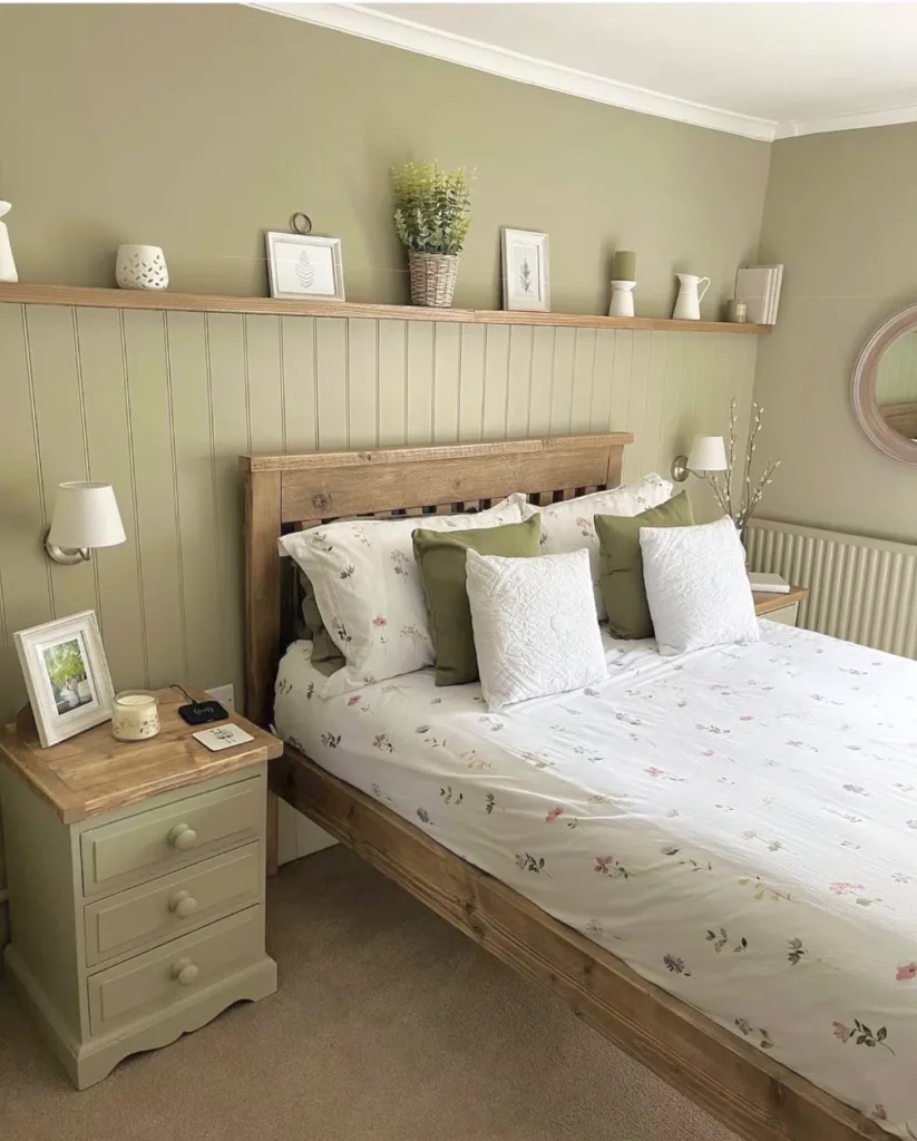 This inviting sage green bedroom uses a clever wooden picture ledge to display curated decor above the bed. The vertical shiplap paneling adds architectural depth while keeping the space feeling light and airy. You will notice how the warm wood tones of the bed frame perfectly match the shelving and nightstand top.