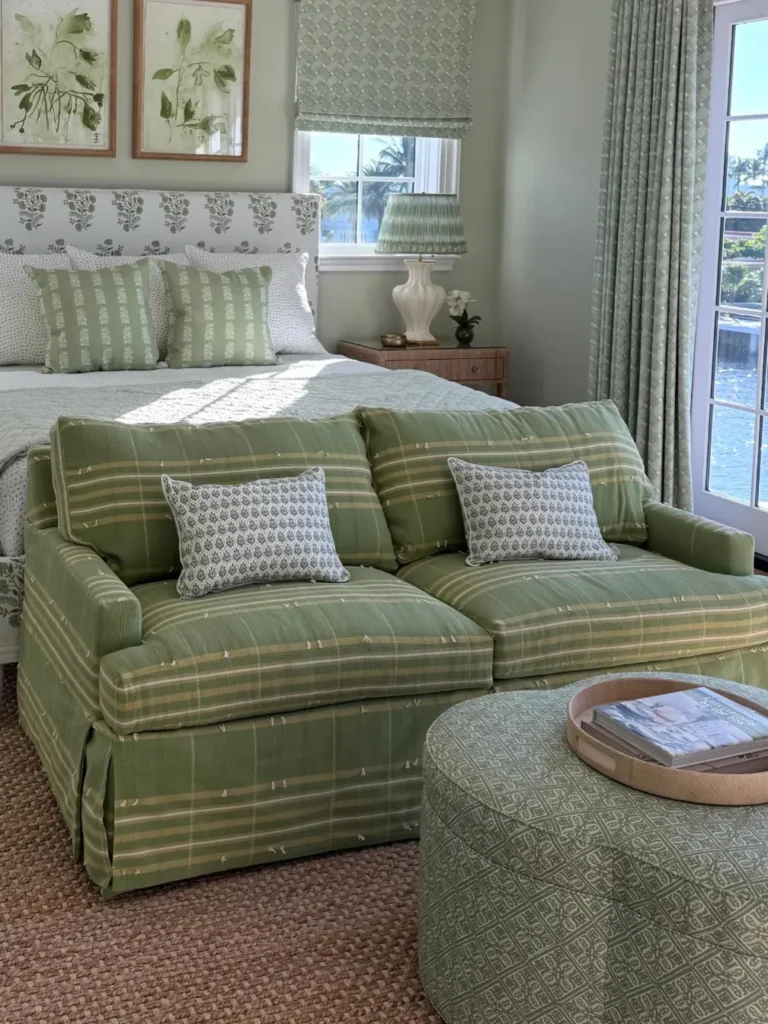 A patterned ottoman with a wooden tray provides a convenient spot for books or morning coffee. The soft lighting from the traditional table lamp creates a warm and inviting atmosphere. You should use these varied green patterns to create a cohesive and deeply layered look in your primary suite