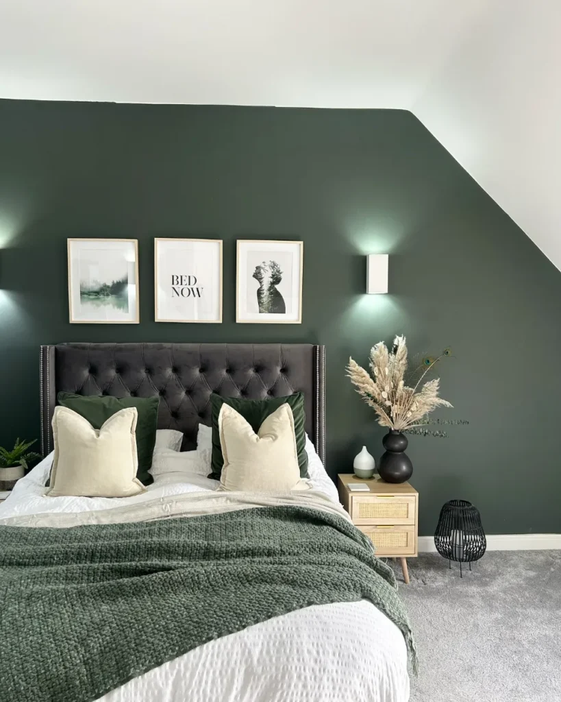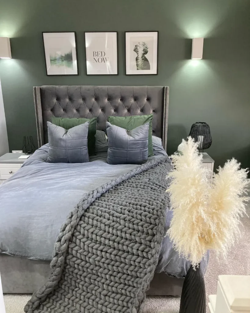This striking sage green bedroom features a deep, saturated accent wall that creates a sophisticated and moody atmosphere. The charcoal tufted headboard adds a layer of luxury and serves as a strong focal point against the dark paint. You will notice how the chunky knit grey throw introduces a heavy, tactile element for ultimate comfort.