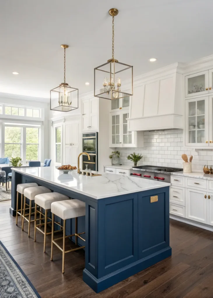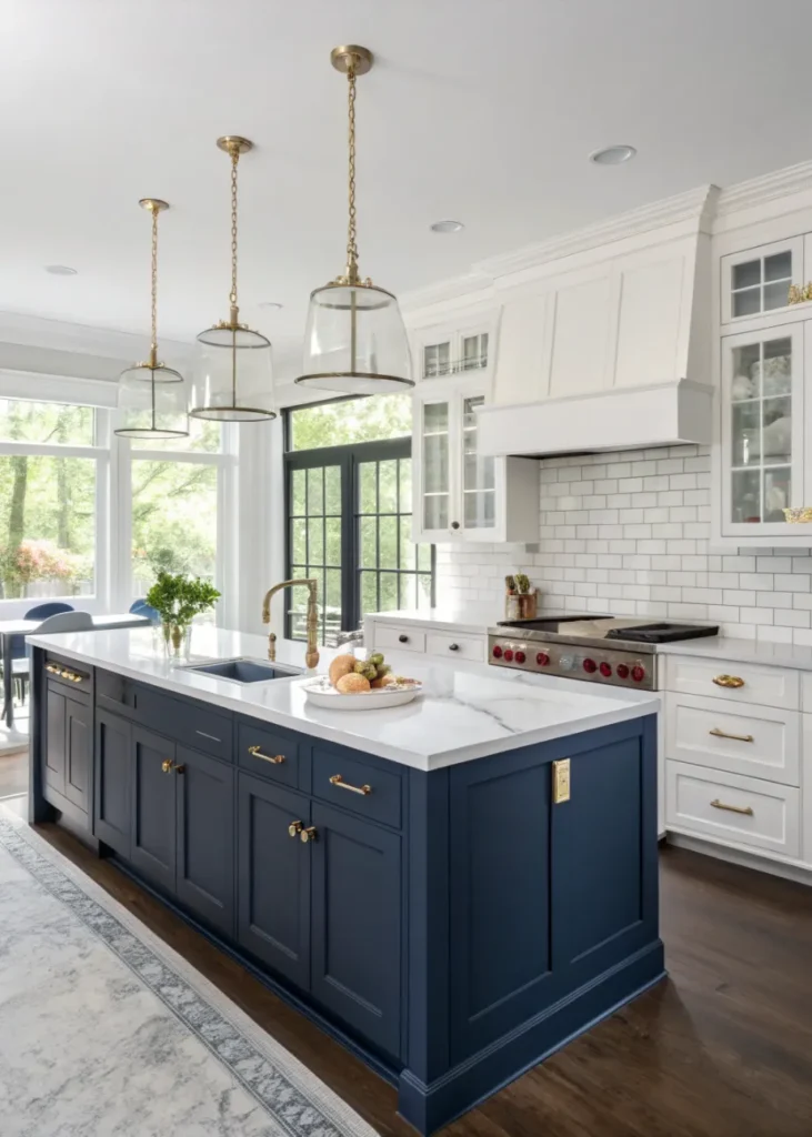 Make your kitchen island the star of the show by painting it a stunning midnight blue while keeping all perimeter cabinets bright white. This approach creates a focal point that draws the eye and adds drama to your space. The white cabinets ensure the kitchen stays bright and open, while the blue island provides a pop of color and personality. This works beautifully in open-concept layouts where the island is visible from other rooms.