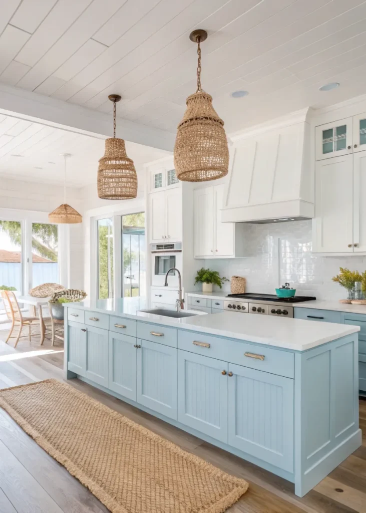 Capture the breezy feel of coastal living by pairing light blue lower cabinets with crisp white upper cabinets. This combination evokes the colors of sea and sky, creating a fresh, airy atmosphere perfect for beach houses or anyone who loves coastal style. The light blue adds gentle color while keeping the space feeling open and bright. Pair with white countertops and natural fiber accessories for a complete coastal look.
