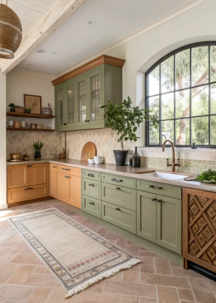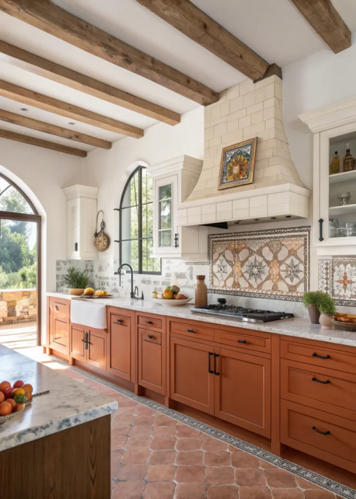 Capture the warmth of Mediterranean style by pairing warm terracotta lower cabinets with bright white upper cabinets. This combination brings earthy warmth and rustic charm to your kitchen while keeping it light and bright. The terracotta adds rich, sun-baked color that feels both timeless and trendy. Complete the look with natural wood accents, wrought iron hardware, and colorful tile details.