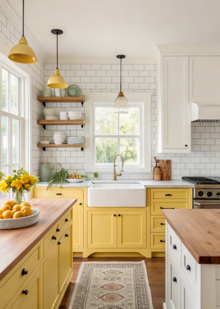 Brighten your kitchen with cheerful soft yellow lower cabinets paired with clean white upper cabinets. This sunny combination brings warmth and happiness to your cooking space without being overwhelming. The muted yellow adds personality and warmth, while the white keeps things fresh and crisp. This look pairs beautifully with white subway tile, butcher block countertops, and vintage-inspired hardware.