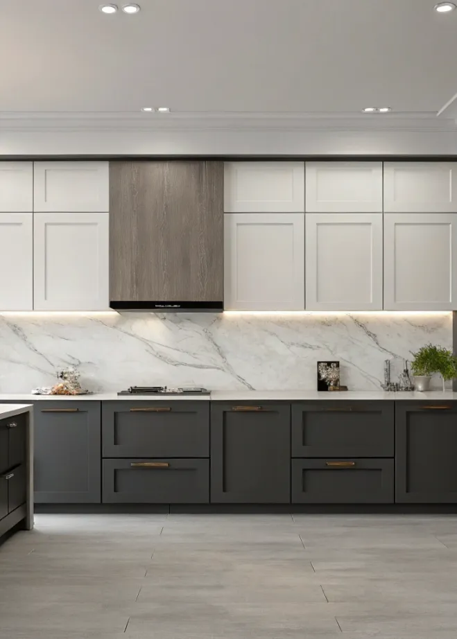 The most popular two tone kitchen cabinet style features white or light-colored upper cabinets paired with darker lower cabinets or a contrasting island. Navy and white, gray and white, and natural wood with painted cabinets are among the most requested combinations.