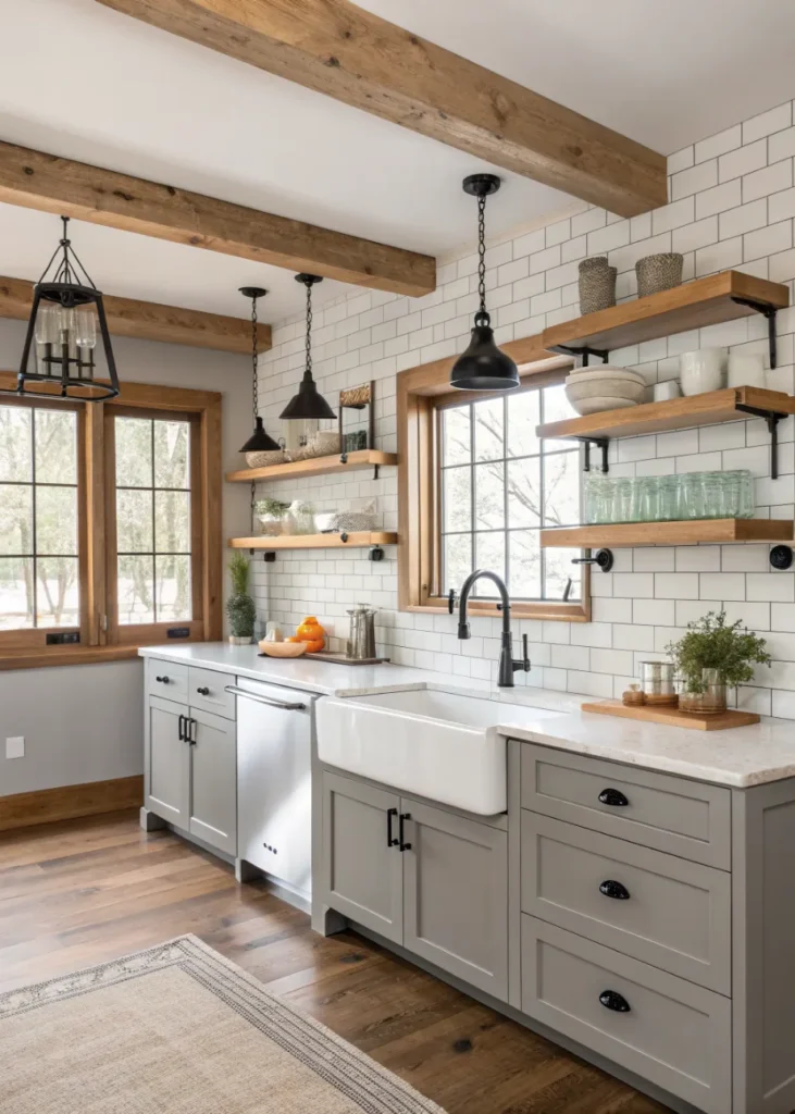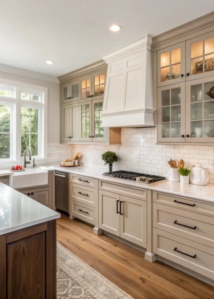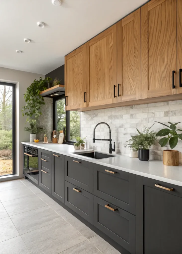 Blend contemporary style with rustic charm by pairing warm gray painted cabinets with natural oak wood cabinets. This combination is perfect for achieving the modern farmhouse aesthetic that’s so popular today. The gray provides a neutral backdrop while the oak adds texture and warmth. This pairing works beautifully with farmhouse sinks, open shelving, and industrial-style lighting.