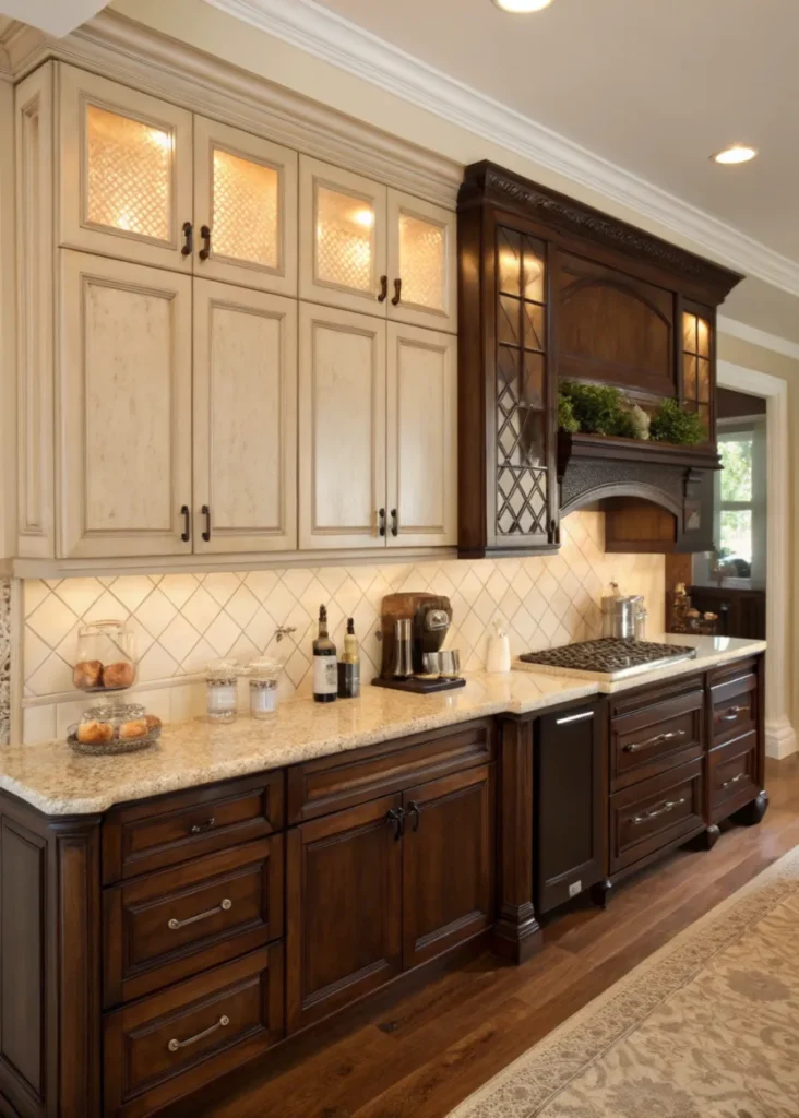 Bring rich, coffee-inspired tones to your kitchen by combining dark espresso lower cabinets with soft cream upper cabinets. This combination creates a warm, inviting space with a classic feel. The dark espresso adds drama and sophistication while hiding everyday wear, and the cream keeps the space from feeling too dark. This look pairs beautifully with granite or quartz countertops and oil-rubbed bronze hardware.