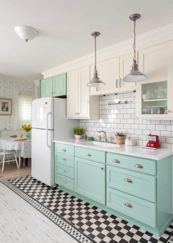 Channel vintage charm by pairing soft mint green lower cabinets with crisp white upper cabinets. This retro-inspired combination brings a playful, fresh feel to your kitchen while maintaining a light, airy atmosphere. The mint adds just the right amount of color and personality without overwhelming the space. Complete the look with white subway tile, checkerboard floors, and vintage-style fixtures.