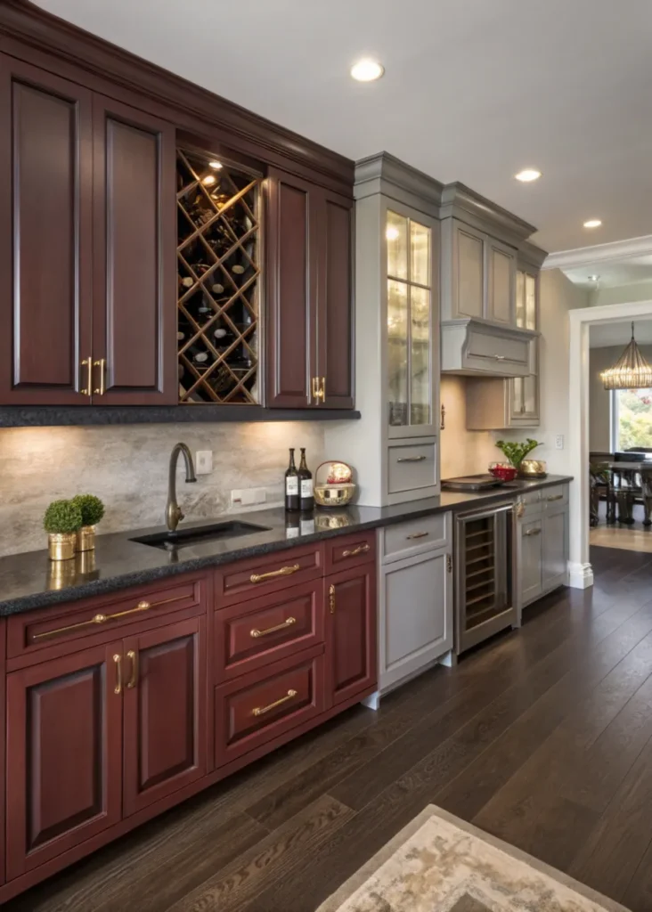 Create a sophisticated, wine country-inspired kitchen by combining rich burgundy lower cabinets with soft gray upper cabinets. This unexpected pairing brings warmth and elegance to your space with a unique color combination. The burgundy adds depth and richness while the gray provides a modern, neutral balance. This look works beautifully with dark countertops and antique brass hardware.