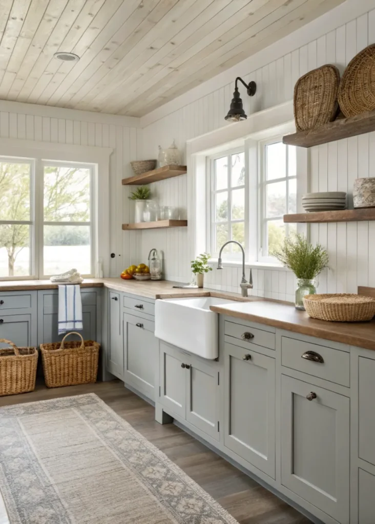 Achieve a relaxed, coastal cottage feel by pairing weathered gray lower cabinets with bright white upper cabinets. This combination creates a casual, lived-in look that feels both comfortable and stylish. The weathered finish adds character and texture, while the white keeps things light and beachy. Pair with butcher block countertops, beadboard details, and casual pendant lighting for a complete cottage look.