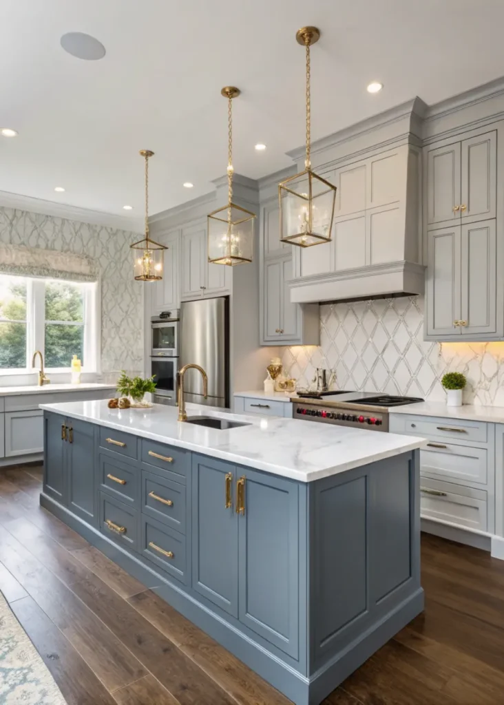 Elevate your kitchen with sophisticated slate blue cabinets paired with lighter neutral tones and accented with brass details. This combination creates a glamorous, contemporary space that feels luxurious and refined. The slate blue adds rich color and drama while maintaining sophistication. The brass hardware and fixtures add warmth and a touch of luxury that completes this elegant look.