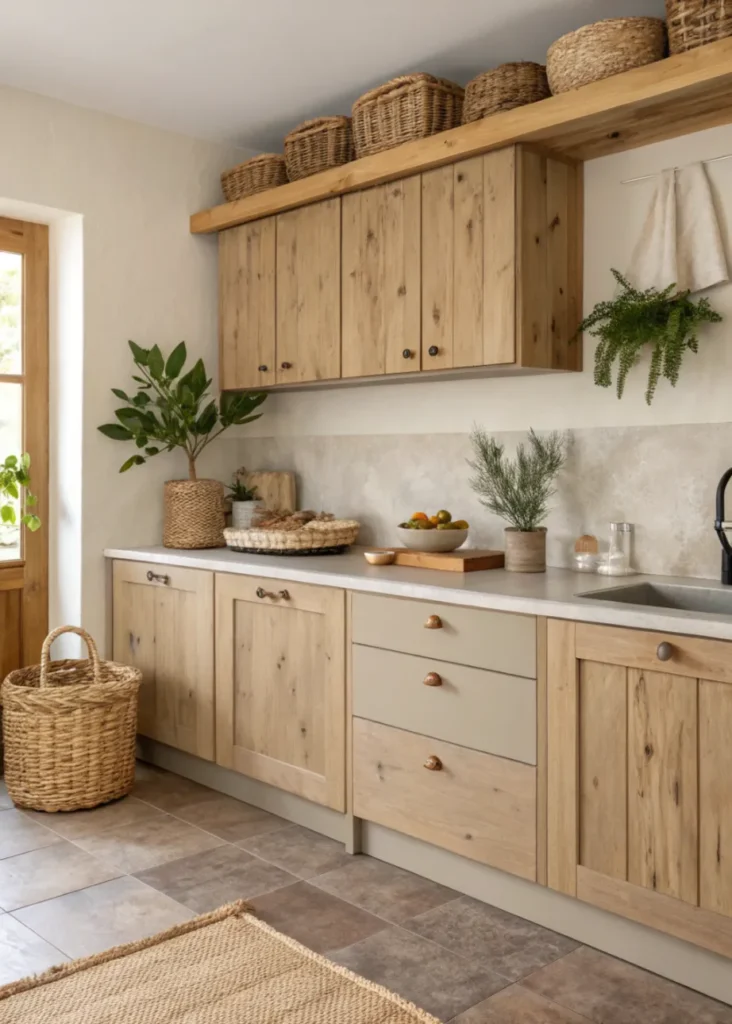 Create an organic, nature-inspired kitchen by combining mushroom taupe painted cabinets with natural pine wood cabinets. This earthy combination brings warmth and texture while maintaining a neutral palette. The taupe provides a sophisticated backdrop while the pine adds natural beauty and character. This pairing works wonderfully with natural stone countertops, woven accessories, and plants.