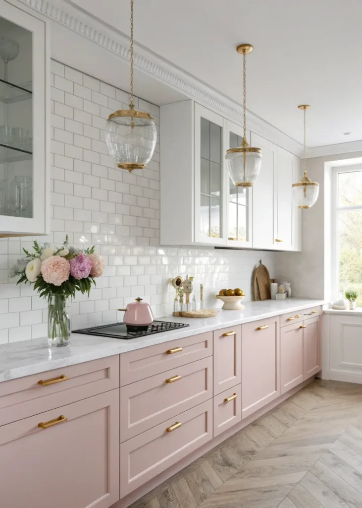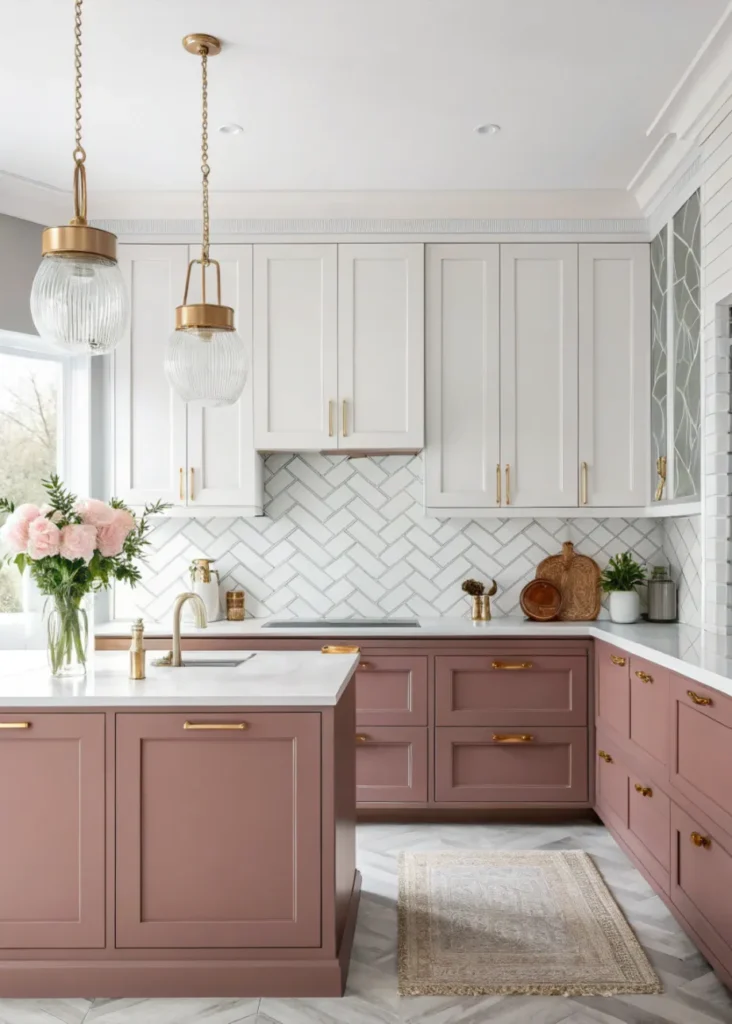 Create a soft, romantic kitchen by combining pale blush pink lower cabinets with pristine white upper cabinets. This gentle, feminine combination adds personality without being overwhelming. The pink brings unexpected charm and warmth, while the white keeps the space feeling fresh and clean. This look pairs beautifully with marble countertops, gold hardware, and delicate pendant lighting.