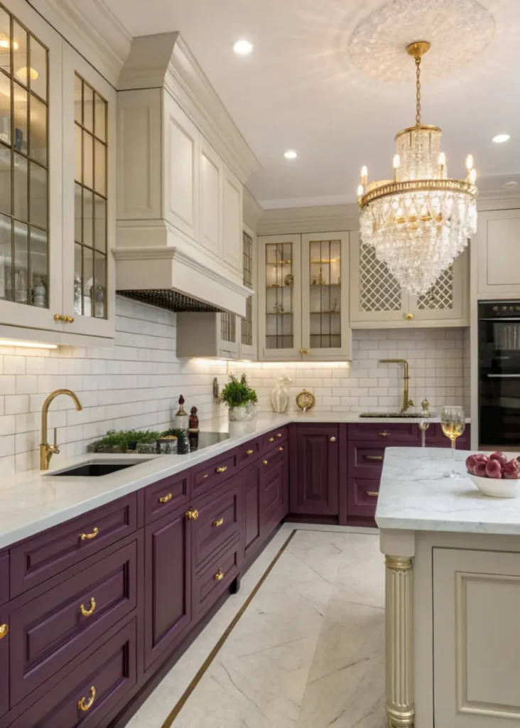 Create a dramatic, luxurious kitchen by combining deep plum lower cabinets with soft cream upper cabinets. This bold combination brings rich color and sophistication to your space while maintaining balance. The plum adds unexpected drama and elegance, while the cream provides a soft, light contrast. This pairing works beautifully with gold hardware, marble countertops, and crystal chandeliers.