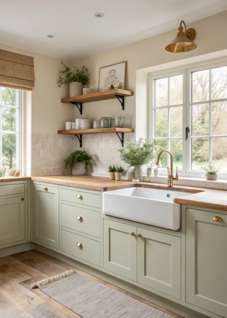 Create a calming, nature-inspired kitchen by blending soft sage green lower cabinets with warm cream upper cabinets. This gentle color combination brings an earthy, organic feel to your space while maintaining a light and fresh atmosphere. The muted tones work wonderfully in both farmhouse and contemporary settings. Add brushed gold hardware and natural wood accents to complete this serene look.