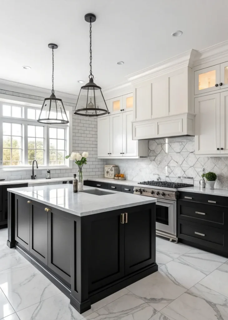 Make a bold statement with the ultimate contrast: black lower cabinets paired with white upper cabinets. This high-contrast combination creates a striking, modern look that never goes out of style. The black grounds the space and provides a sophisticated foundation, while the white keeps things from feeling too heavy. This pairing works exceptionally well in kitchens with plenty of natural light and looks stunning with marble countertops.