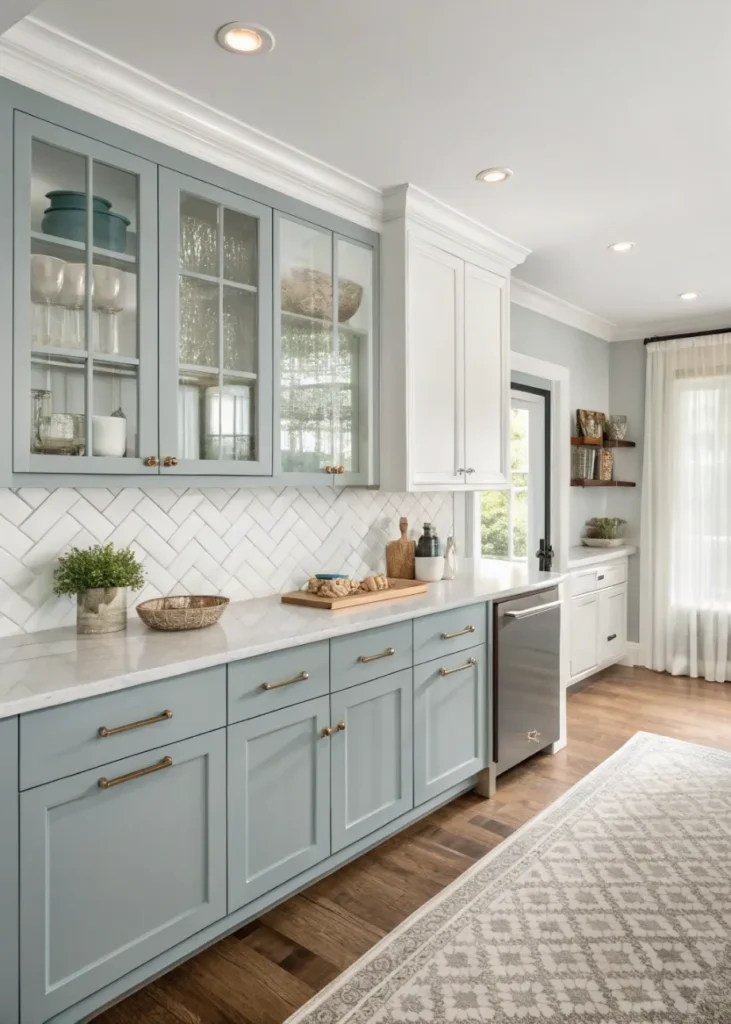 Achieve a serene, spa-like atmosphere by combining soft blue-gray lower cabinets with clean white upper cabinets. This subtle two-tone approach creates visual interest without overwhelming the space. The muted blue-gray adds just enough color to keep things interesting while maintaining a calm, peaceful vibe. This combination pairs beautifully with white subway tile backsplash and stainless steel appliances.
