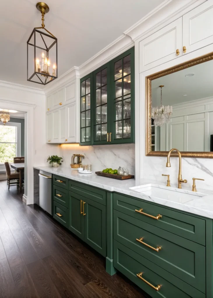 Embrace rich, jewel-toned elegance with forest green cabinets paired with lighter neutral tones on your uppers. This luxurious combination brings depth and personality to your kitchen while feeling sophisticated and timeless. The deep green works particularly well on lower cabinets or a kitchen island, creating a grounded, elegant look. Complete the design with brass hardware and fixtures for added warmth and glamour.