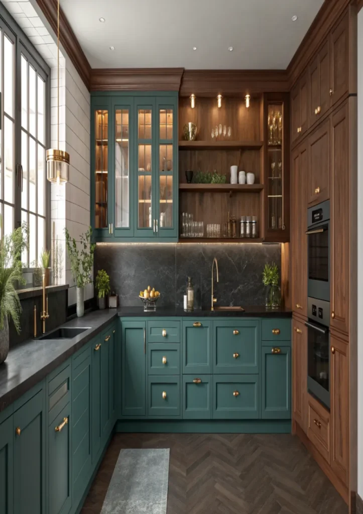 Bring sophisticated depth to your kitchen with deep teal lower cabinets complemented by rich walnut wood uppers or open shelving. This combination creates a moody, elegant atmosphere that feels both modern and timeless. The teal adds vibrant color while the walnut introduces natural warmth and texture. This pairing works exceptionally well with brass or copper fixtures and dark countertops.